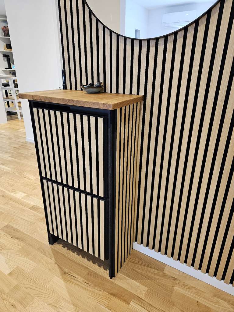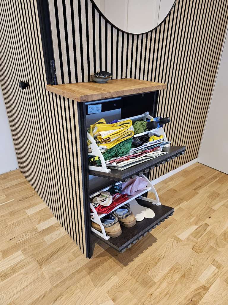 Im Hintergrund sieht man die Eingangseckenwand komplett mit Akustikpaneelen verkleidet, was nicht nur die Kellertreppentür gut tarnt, sondern auch die Akustik im Eingangs- und Küchenbereich verbessert. Durch die Verkleidung des Schuhregals verschmilzt es harmonisch mit der Wand.