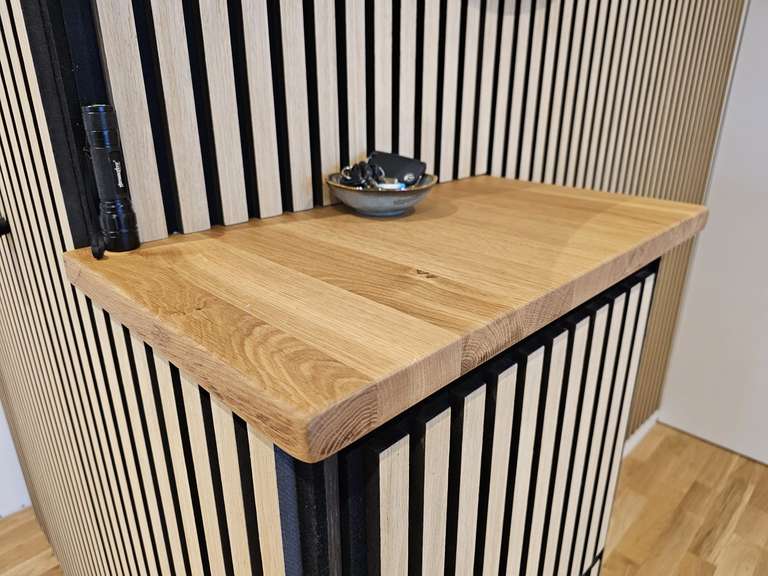 Als stilvolle Ablagefläche habe ich oben auf dem Schuhregal ein geöltes, edles Eichenholz platziert. Die Holzplatte habe ich nach dem Zuschnitt geschliffen und die Kannten gerundet, damit sich zum Beispiel unsere Tochter Nova-Skylar eines Tages entspannt den Kopf stoßen kann ohne weitere Folgen ;)
