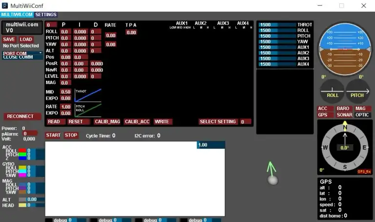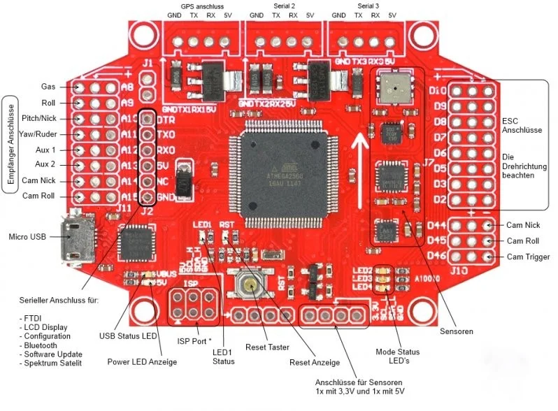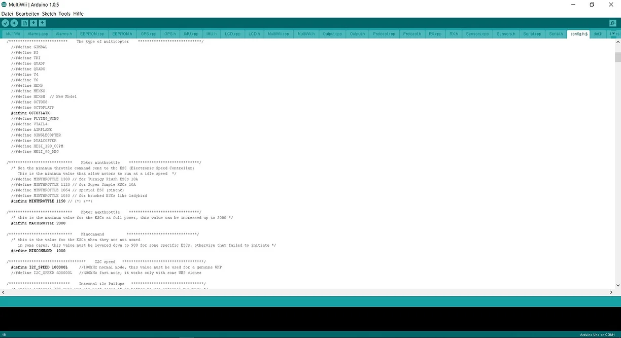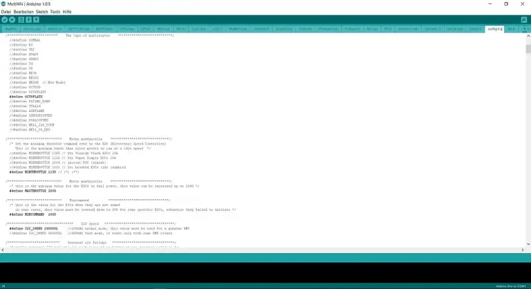 Es läuft mit einem arduinogestützen Code. Der MultiWiivorprogrammierte Code ist schon sehr umfangreich und lässt viele Möglichkeiten zu. Es ist aber eine gewisse Grundkenntnis nötig, um zu verstehen, dass man zum Beispiel den COM (USB Anschluss) definieren muss, (an dem das Board angeschlossen ist). Weiter geht es mit der Baudrate, mit der der Laptop mit dem MultiWiiboard kommuniziert. Wenn man dann nach vielen ausprobieren, manchmal auch eher mit Zufall, die richtige Einstellung findet und endlich kein Fehlercode mehr auftaucht, wenn man versucht seinen Code auf das Board zu laden, dann ist das schon ein gutes Gefühl von Erfolg.