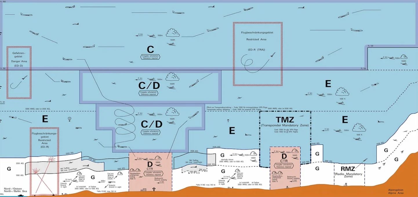 • Der restliche Luftraum A, B, C ,D, E und ED-R sind kontrollierte Lufträume und für Modelflug, Drohnen, Multicopter verboten.