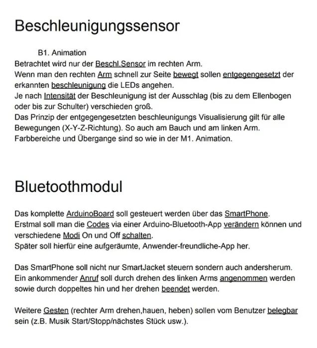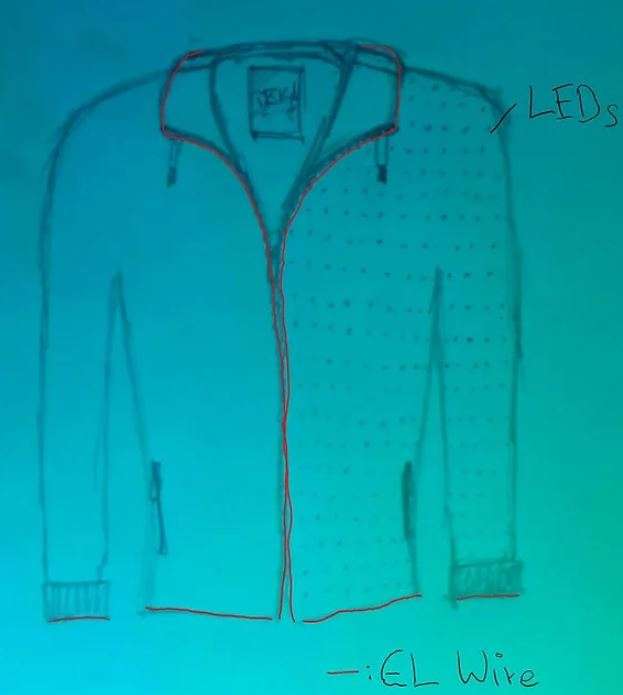 Zusätzlich zu den LEDs sollen EL-Wires an der Jacke installiert werden. Diese befinden sich direkt neben dem Reißverschluss und gehen auch über die Kaputzenvorderkante (falls vorhanden). Auch an der Jackenunterkante und an den Ärmelenden sollen EL-Wires verbaut werden. Diese können in den verschiedensten Farben sein. Ich habe momentan Neongrün, Weiß, Rot und Blau. Auf der Jackenrückseite kann ein roter EL-Wire zum Einsatz kommen der zum Beispiel beim Fahrradfahren eingeschaltet werden kann. Durch die perfekte hohe Position der Rückfahrlampe, ist die Jacke ein guter Sicherheitsfaktor. Sensoren und weitere Programme lassen sich sehr gut in die Jacke integrieren wobei das Smartphone immer die Benutzeroberfläche ist. Die Jacke kann Mikrofon- Temperatur- Bluetooth- und Herzschlag Sensoren besitzen. Somit lässt sich sehr viel auf der Jacke Visualisieren wie die Musik, der Herzschlag oder die Temperatur an verschiedenen Körperregionen. Diese Daten lassen sich natürlich auch auf den Smartphone speichern.