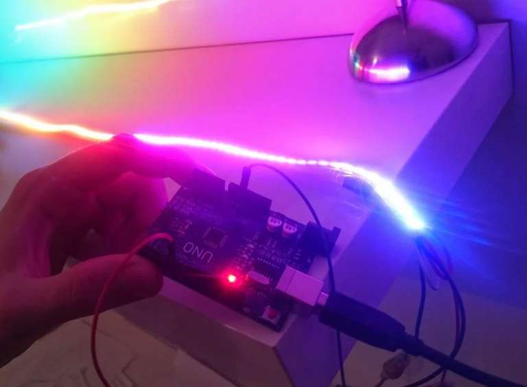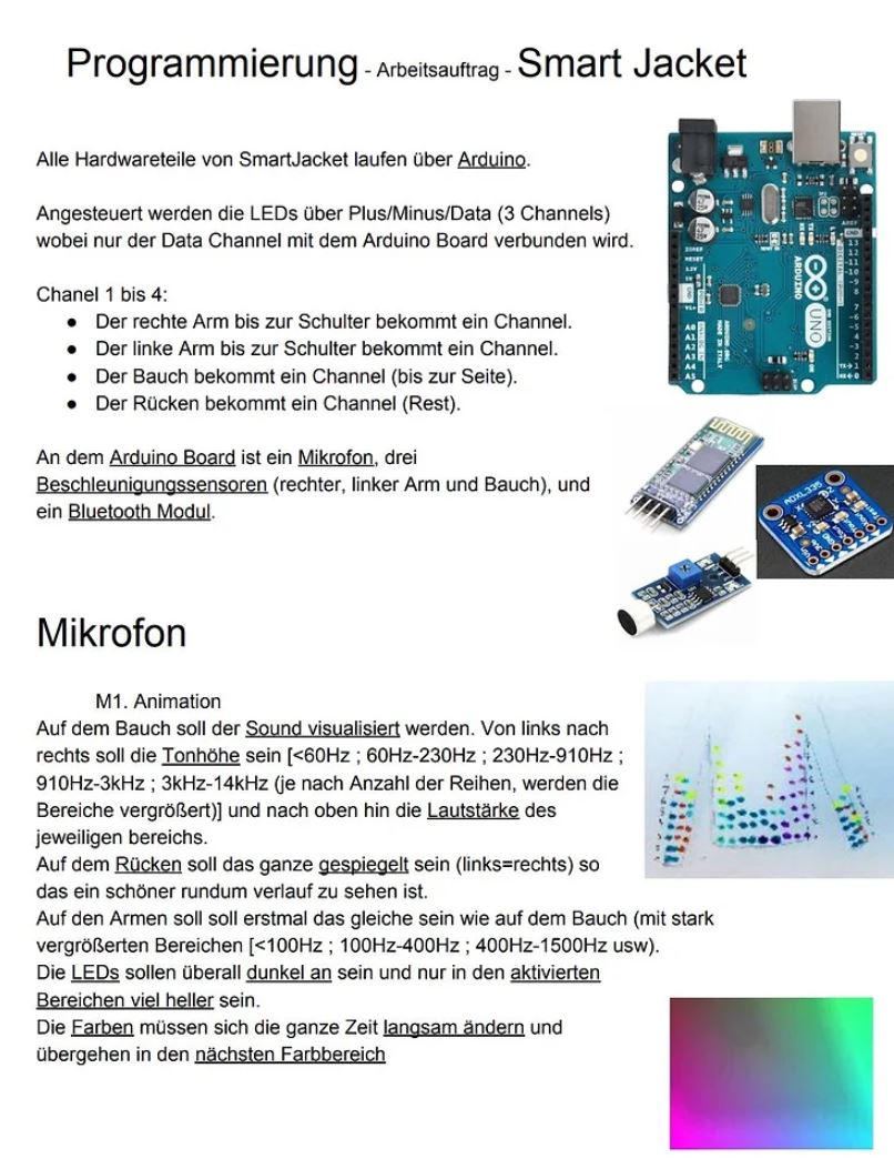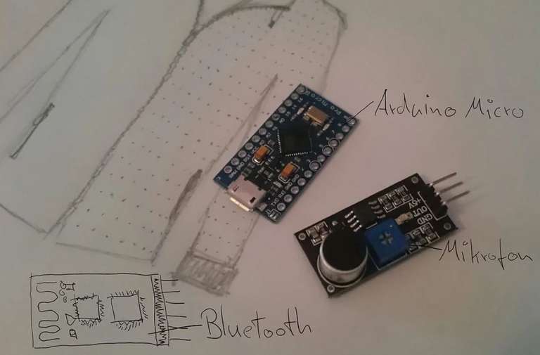 Eins meiner Projekte ist die LED Jacke. Es werden im Abstand von ca. 8 cm LEDs überall in eine leichte Herbstjacke verbaut. Das LED Netz trägt weiter nicht auf, da die LEDs über ein bewegliches Flachkabel verbunden sind. Es kommen momentan WS2812B 5050 SMD LEDs zum Einsatz, welche alle einzeln angesteuert werden können von einem Arduino Board. Momentan (Testphase) hängen die LEDs an einem Arduino UNO. Es soll aber noch, auf den Arduino Pro Micro umdisponiert werden. Ein BluetoothModul soll auch noch verbaut werden um bestimmte Funktionen in einer kleinen App vom Smartphone aus zu aktivieren. Somit kann man z.B. die Farbe seiner Jacke steuern. Ein Mikrofon- Modul ist für eine Musik Visualisierung auf der Jacke. Bässe oder andere musikalische Ausschläge können so in verschiedener Formen und Animationen auf der Jacke angezeigt werden.