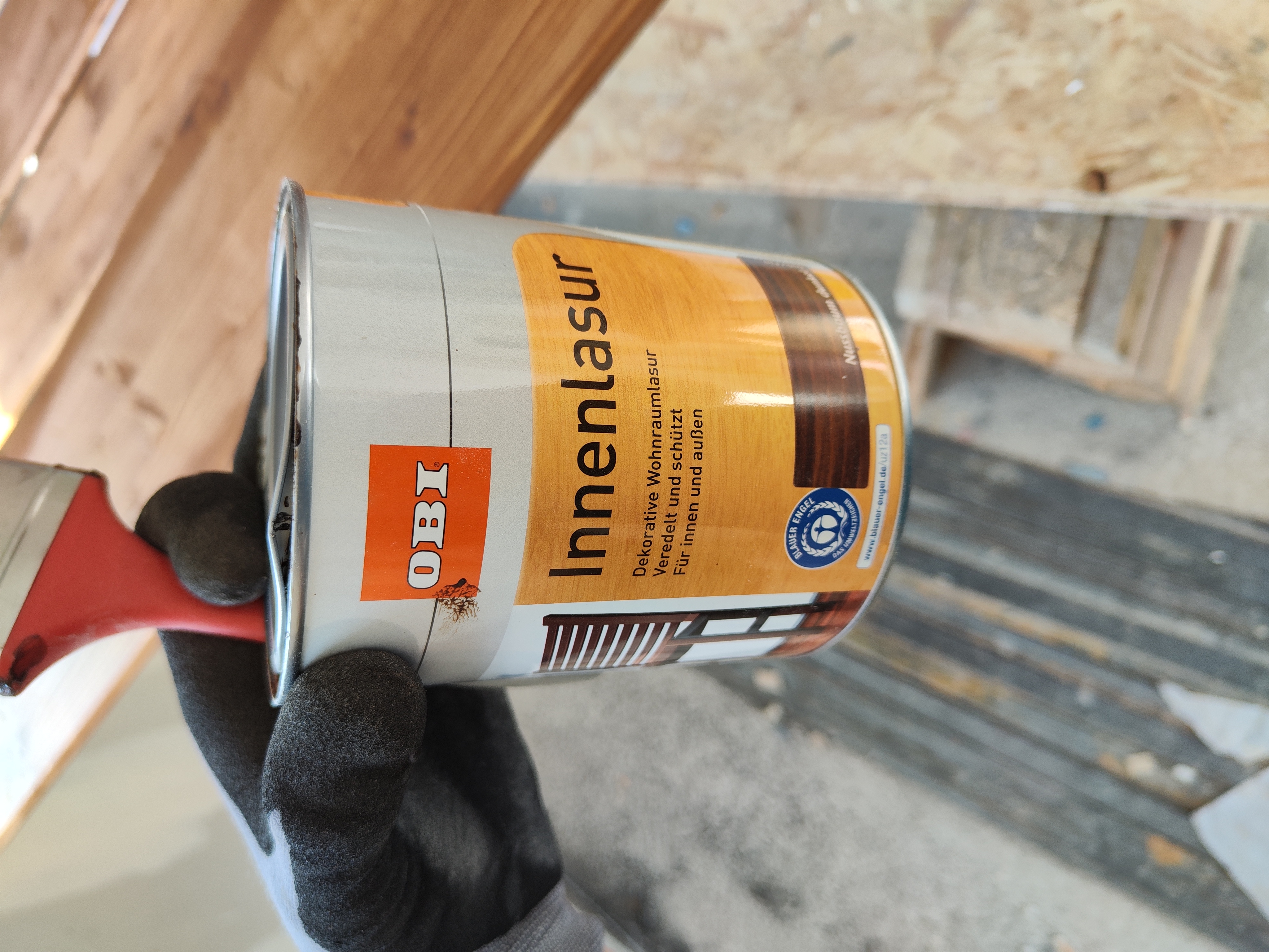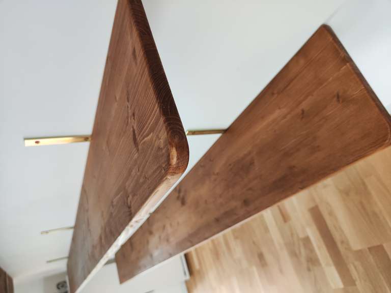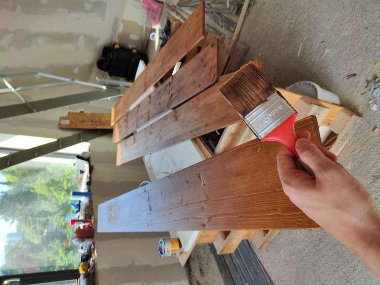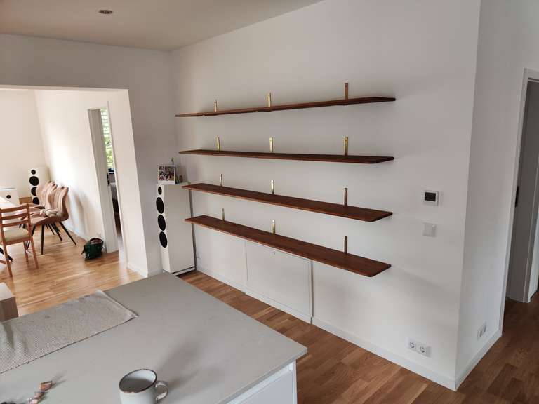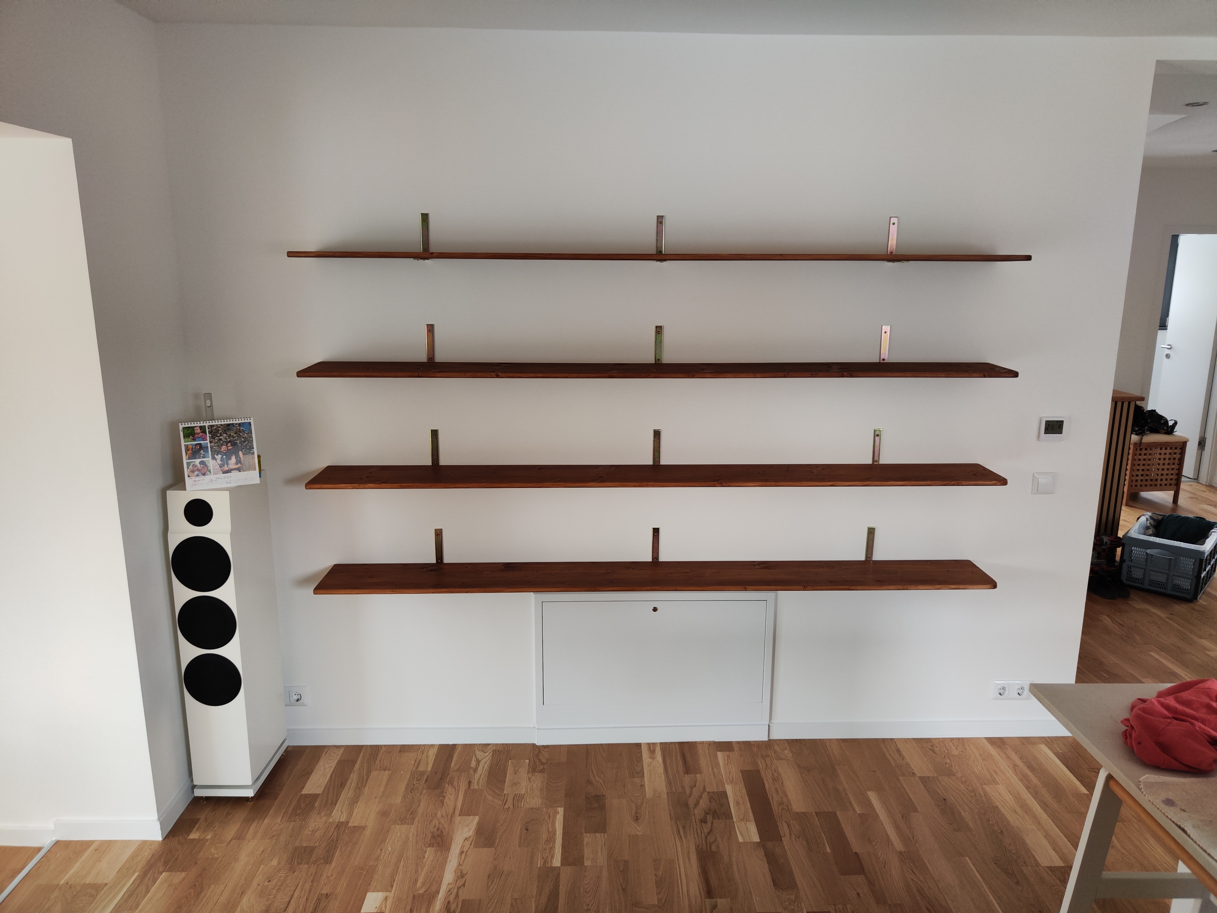 Das Regal besteht aus hochwertigem Akazienholz, das ich zugeschnitten und geschliffen habe. Durch die Anwendung einer dunklen, warmen Lasur erhält das Regal eine zeitlose und ansprechende Optik (sieht etwas aus wie geöltes Eichenholz wie bei dem TV-Board oder der Flurablage).